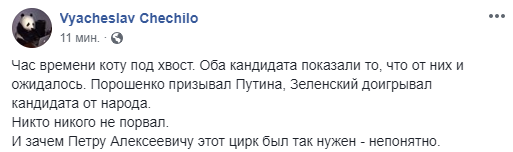 "Послушал первые 5 минут выступления Порошенко и Зеленского. Зеленский говорит от души. То, что думают, и как ощущают происходящее украинцы. До мурашек.