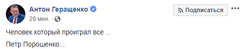 "Человек который проиграл все ... Петр Порошенко..." - написал в Сети даже нардеп Антон Геращенко, который раньше поддерживал президента и действующую власть.