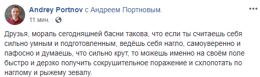 "Друзья, мораль сегодняшней басни такова, что если ты считаешь себя сильно умным и подготовленным, ведёшь себя нагло, самоуверенно и пафосно и думаешь, что сильно крут, то можешь именно на своём поле быстро и дерзко получить сокрушительное поражение и схлопотать по наглому и рыжему зевалу", - считает юрист Андрей Портнов.
