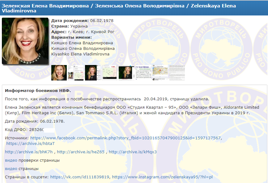 Сегодня, 20 апреля, на скандальный сайт "Миротворец" внесли супругу кандидата в президенты Владимира Зеленского Елену. Причина, по которой Елена Зеленская попала на сайт - "информатор боевиков". Об этом говорится в описании на сайте.