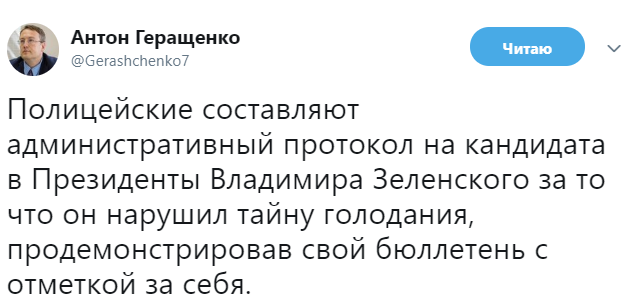 "Полицейские составляют административный протокол на кандидата в президенты Владимира Зеленского за то, что он нарушил тайну голодания, продемонстрировав свой бюллетень с отметкой за себя", – написал Геращенко на своей странице в Twitter.