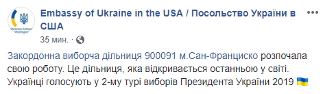На выборах президента Украины последним открылся участок в Сан-Франциско. Об этом сообщает посольство Украины в США на странице в Facebook.
