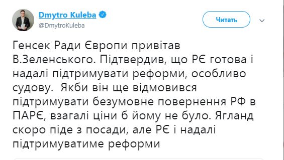 Посол Украины в Совете Европы Дмитрий Кулеба прокомментировал поздравления Ягланда. "Генсек Совета Европы поздравил Зеленского. Подтвердил, что СЕ готов и в дальнейшем поддерживать реформы, особенно судебную. Если бы он еще отказался поддерживать безусловное возвращение РФ в ПАСЕ, вообще цены бы ему не было. Ягланд скоро уйдет с должности, но СЕ и далее будет поддерживать реформы", - написал Кулеба в Twitter.