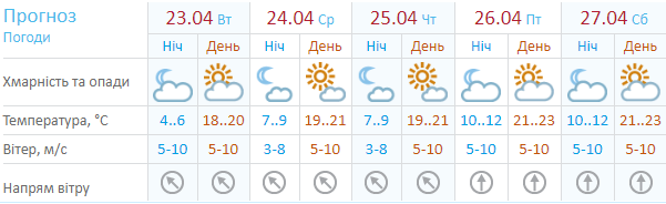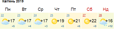 Ресурс Мeteoprog.ua сообщает, что с начала недели дневная температура будет постепенно повышаться с +16 до +23 на выходных. С 22 по 27 апреля - преимущественно солнечно, без осадков. А на Пасху, 28 апреля, по данным этого сайта, будет тепло, но пасмурно.
