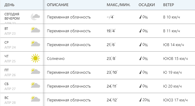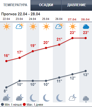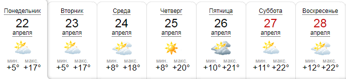 Сайт Gismeteо также прогнозирует отличную для прогулок погоду: солнце и температуру до +17...+22. Правда, на Пасху, 28 апреля, по данным этого ресурс может пройти дождь, а температура снизится до +16.