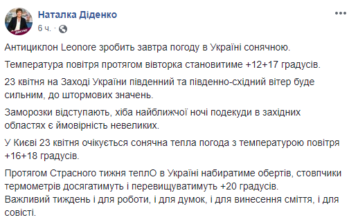 По данным синоптика Opogode Натальи Диденко, 23 апреля погоду в Украине будет определять антициклон Леонор. Он принесет тепло до +12...+17. При этом на западе во вторник обещают сильный практически штормовой ветер. В Киеве 23 апреля - тепло и солнечно, столбики термометров поднимутся до +16...+18.