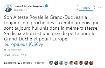 "Его Королевское Высочество Великий герцог Жан всегда был близок к люксембуржцам, которых сегодня объединяет одна и та же грусть. Его исчезновение - большая потеря для Великого Герцогства и для Европы", - написал в Twitter председатель Европейской комиссии и экс-премьер-министр Люксембурга Жан-Клод Юнкер.