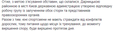 По данным Госреестра вещных прав на недвижимое имущество, на эту недвижимость наложено обременение. Чтобы выяснить обстоятельства событий Дарницкая РГА создала рабочую группу с привлечением обеих сторон и представителей правоохранительных органов. А вопрос о месте тренировки для спортсменов, до момента разрешения спора, рассмотрят в течение дня.