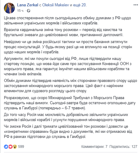 При этом Зеркаль подчеркнула, что до начала слушаний Россия может добровольно освободить украинских моряков и военные корабли, и устранить нарушение международного права.