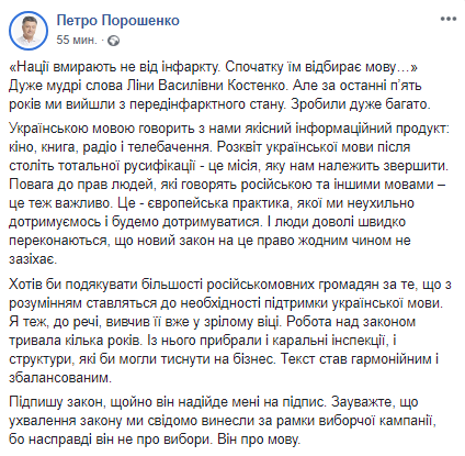 Президент Петр Порошенко заявил, что подпишет закон о функционировании украинского языка как государственного, принятый 25 апреля Верховной Радой, как только документ поступит к нему на подпись. Об этом он рассказал в обращении, опубликованном в его Facebook.