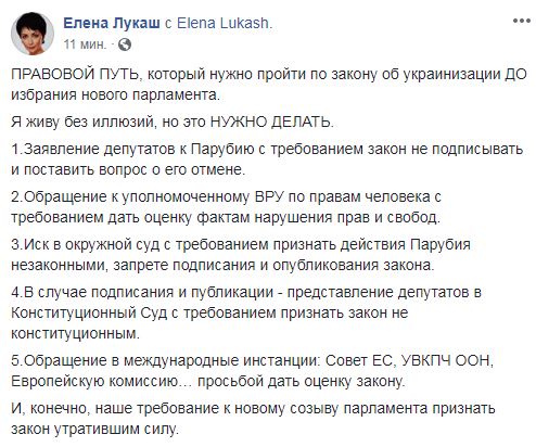Известный юрист и экс-министр юстиции Елена Лукаш рассказала, как по шагам можно отменить закон о тотальной украинизации, который сегодня приняли в Верховной Раде. Об этом Лукаш написала в Facebook.