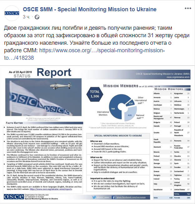 На территории Донбасса за этот год погибли 31 человек среди гражданского населения. Об этом говорится в отчете Специальной мониторинговой миссии (СММ) ОБСЕ, опубликованном сегодня в Facebook, 25 апреля.