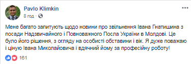 "Меня многие спрашивают относительно новости об увольнении Ивана Гнатишина с должности Чрезвычайного и Полномочного Посла Украины в Молдове. Это было его решение, учитывая личные обстоятельства и возраст. Я очень уважаю и ценю Ивана Николаевича и благодарен ему за профессиональную работу", - написал Павел Климкин.