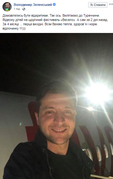 "Договаривались быть открытыми. Так вот. Вылетаем в Турцию. Отвожу детей на ежегодный фестиваль "Весело". А сам через 2 дня назад. За 4 месяца... это первые выходные. Всем желаю тепла, здоровья и нормального отдыха", - написал будущий глава государства.