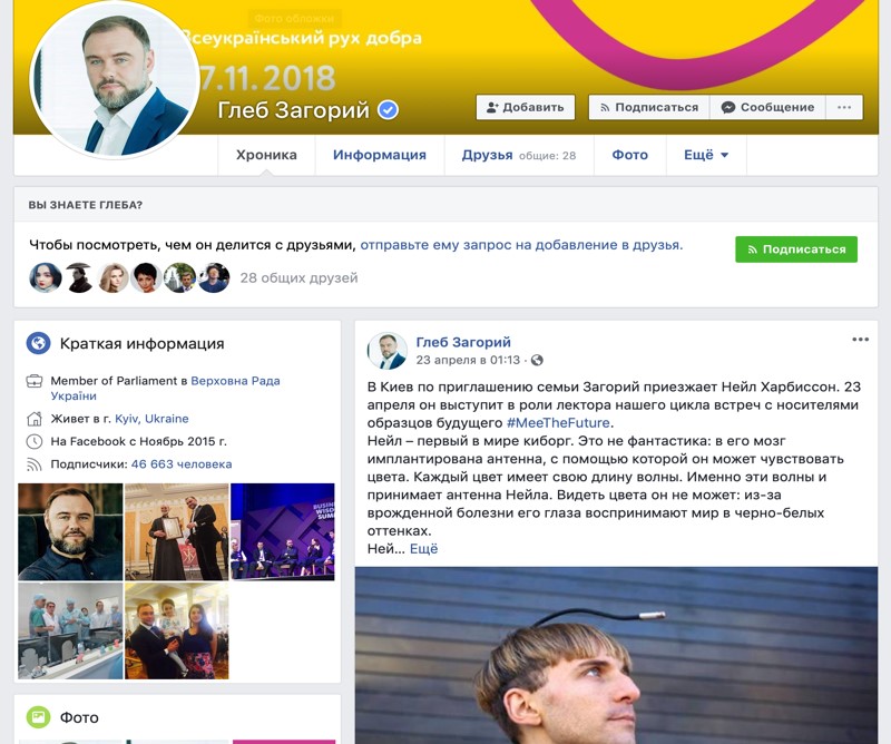 Еще один народный избранник - это Глеб Загорий. Глеб Владимирович впервые стал депутатом. Баллотировался он от БПП. Член Комитета Верховной Рады по делам ветеранов, участников боевых действий, участников антитеррористической операции и людей с инвалидностью. Глеб Загорий большинство своих постов в Facebook пишет на русском языке. Так выглядит его профиль в соцсети Facebook.