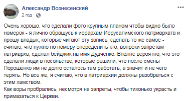 "Очень хорошо, что сделали фото крупным планом чтобы видно было номерок - я лично обращусь к иерархам Иерусалимского патриархата и прошу владык, которые читают эту запись, сделать то же самое - считаю, что нужно по номеру определить кто, вопреки запретам патриарха, сделал бейджик на имя Дудченко. Вполне вероятно, что это сделали люди в посольстве, которые решили, что после смены Порошенко им не долго осталось там работать, а значит и нечего терять. Но все же, я считаю, что в патриархии должны разобраться с этим хамством. Как воры пробрались, несмотря на запреты, чтобы тихонько украсть и примазаться к Церкви", - написал Вознесенский.