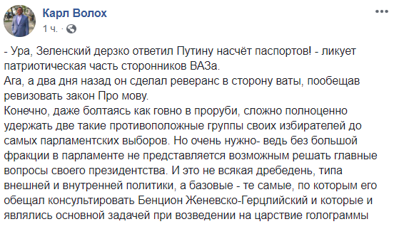"Глупость, к сожалению, станет государственной политикой. В ответ на намерение Путина выдавать российские паспорта украинцам в Украине, Зеленский намерен выдавать украинские паспорта россиянам ... тоже в Украине. Эй, новоизбранные, вы там Путину "ответку" или подарки готовите? Представляете себе количество российских "диссидентов" в звании от прапорщика до полковника ФСБ, ГРУ и других полезных аббревиатур станут в очередь за украинским паспортом? Не представляете? Я так и думал. После этого заявления в Кремле под хохот шампанское открывали, а не заседание Совета Безопасности. Готов он к переговорам,