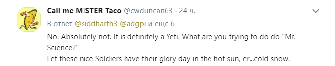 "Со всем уважением к другим участникам дискуссии, тот, кого мы принимаем за йети, на самом деле наверняка либо тяньшанский бурый медведь, либо тибетский бурый медведь. Оба ростом более двух метров и обычно используют для ходьбы только две лапы. А один большой след они оставляют в случаях, когда передвигаются на всех четырех", - пытается объяснить еще один пользователь.