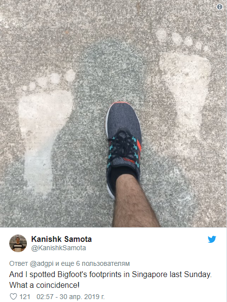 Я в прошлые выходные видел следы "бигфута" в Сингапуре. Какое совпадение!" - радуется Канишк Самота.
