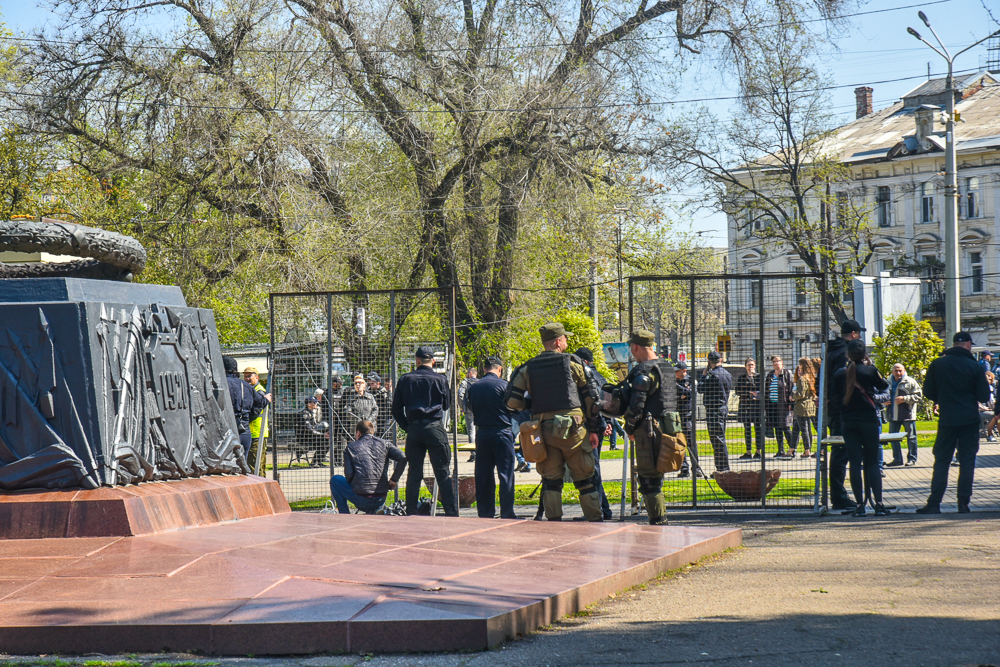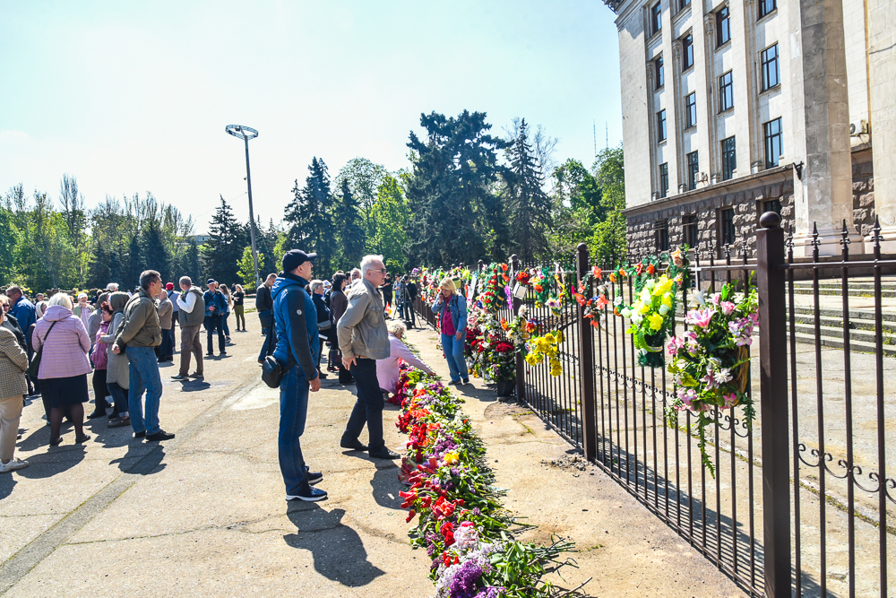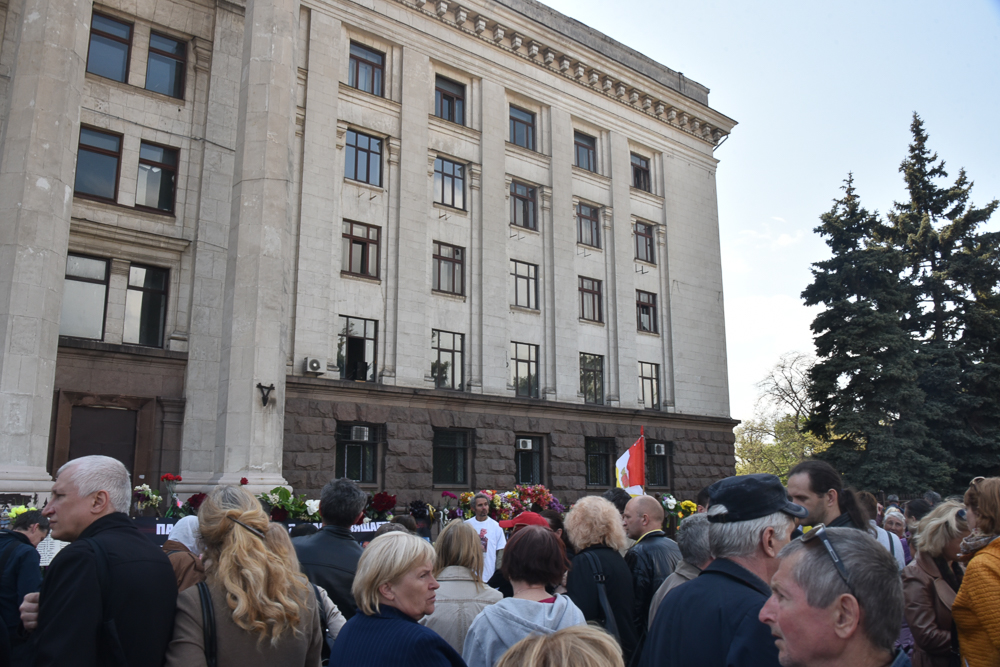 Приблизительно с 8:00 к Куликовому полю приходят одесситы, чтобы почтить память погибших и возложить цветы. Чтобы попасть к главному месту сбору, они проходят плотное оцепление, составленное из полицейских и нацгвардейцев. Кроме того, они должны пройти сквозь четыре импровизированных контрольно-пропускных пункта, на которых их проверяют металлоискателями. Внутри оцепления находится около 70 человек, но за всё время с утра прошло намного большее количество людей - одних меняют другие.
