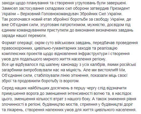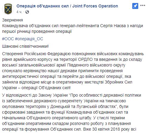 Как известно, операция Объединенных сил началась 30 апреля прошлого года. Она фактически является переформатированием Антитеррористической операции, действовавшей с 2014 года.