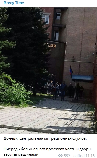 "Донецк, центральная миграционная служба. Очередь большая, вся проезжая часть и дворы забиты машинами", - пишет депутат "Народного совета" Владислав Бердичевский в своем канале Telegram.