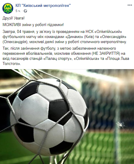 Из-за матча Динамо - Александрия киевское метро 4 мая изменит режим работы