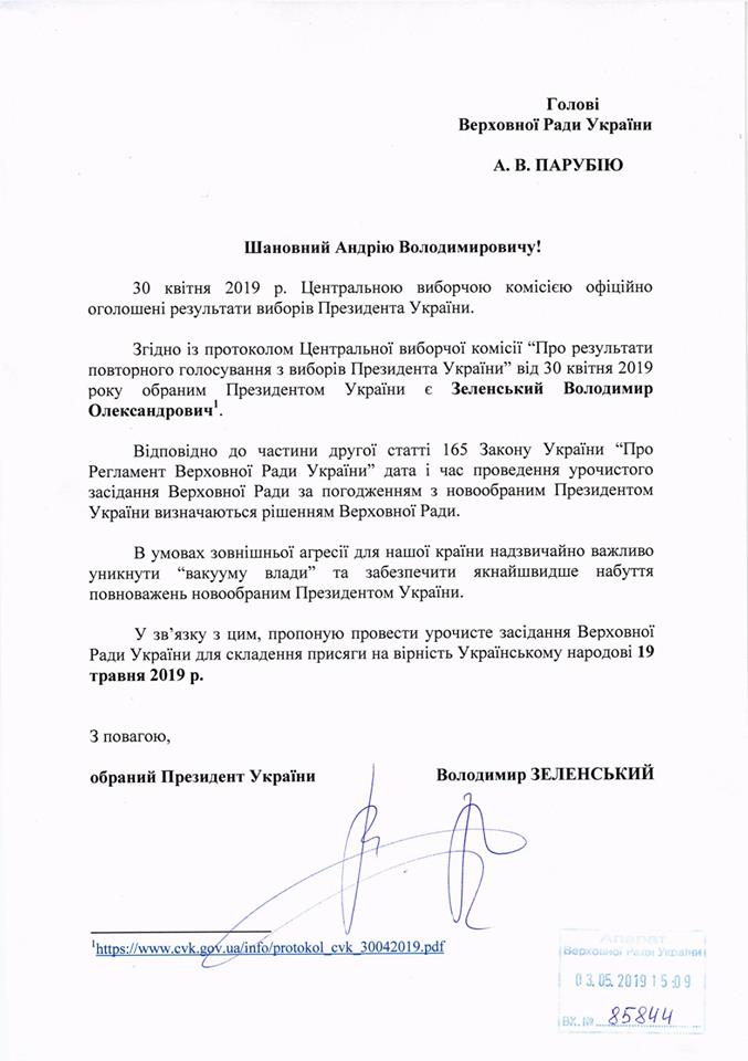 В письме избранный глава государства напомнил Парубию, что 30 апреля ЦИК официально огласил результаты второго тура выборов. А также, что согласно п.2 ст. 165 Закона Украины "О Регламенте Верховной Рады Украины" дата и время церемонии должны назначаться парламентом с согласия новоизбранного президента.