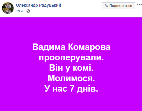 "Вадима Комарова прооперировали. Он в коме. Молимся. У нас 7 дней", - написал он.