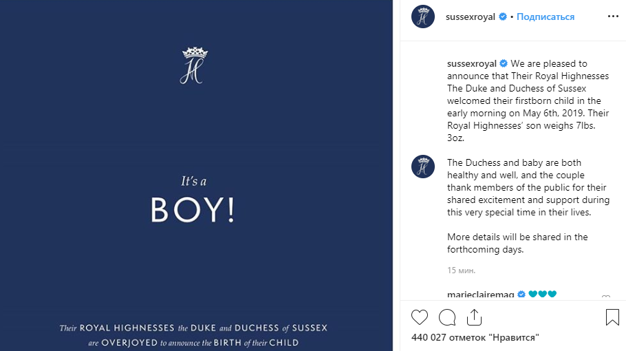 В королевской семье пополнение. В понедельник, 6 мая, герцогиня Сассексская Меган Маркл родила мальчика. Об этом сообщил Букингемский дворец в Instagram. Отмечается, что принц Гарри присутствовал на родах.