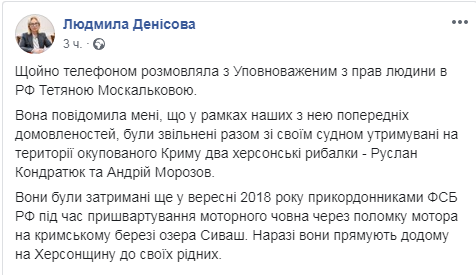 "Только что разговаривала по телефону с уполномоченным по правам человека в РФ Татьяной Москальковой. Она сообщила мне, что в рамках наших с ней предварительных договоренностей были освобождены вместе со своим судном удерживаемые на территории оккупированного Крыма два херсонских рыбака - Руслан Кондратюк и Андрей Морозов", - говорится на фб-странице Денисовой 7 мая.