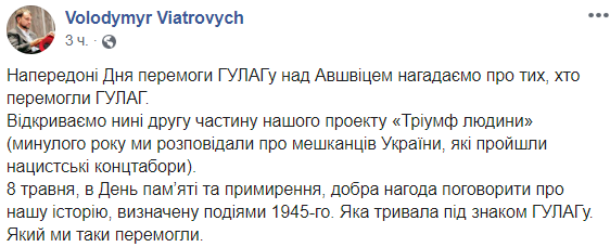 В еще более примирительном тоне глава Институт нацпамяти Владимир Вятрович назвал сегодня 9 мая "Днем победы ГУЛАГа над Аушвицем".
