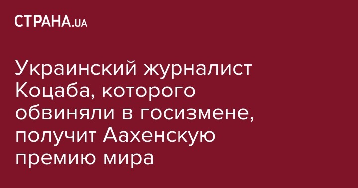 Блогер и журналист Руслан Коцаба, которого власти обвиняли в госизмене, но позже признали невиновным, получит Аахенского премию мира за "смелую борьбу за мир и диалог на Востоке Украины". Об этом пишет DW со ссылкой на представителей организации.