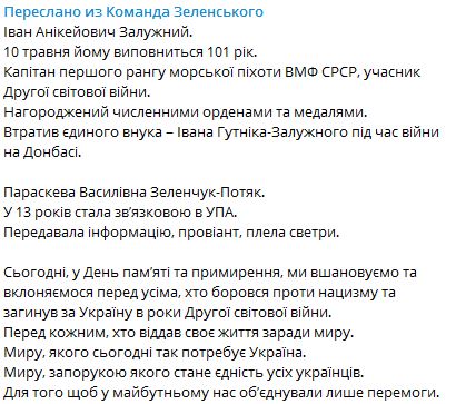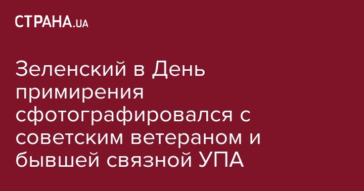 Новоизбранный президент Украины Владимир Зеленский в День примирения, 8 мая, опубликовал фотографию вместе с награжденным участником Второй мировой войны, капитаном первого ранга морской пехоты ВМФ СССР Иваном Залужным и Прасковьей Зеленчук-Потяк, которая в 13 лет стала связной в УПА, передавала информацию и провиант. "Фото примирения" Команда Зеленского выложила в Telegram.