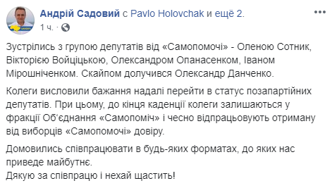 "Встретились с группой депутатов от "Самопомочи" - Еленой Сотник, Викторией Войцицкой, Александром Опанасенко, Иваном Мирошниченко. По Скайпу присоединился Александр Данченко. Коллеги выразили желание в дальнейшем перейти в статус внепартийных депутатов", - пишет Садовый.