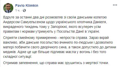 "Второй раз за последние два дня разговаривал со своим датским коллегой Андерсом Самуэльсен об украинском мальчике Даниэле, похищенном неделю назад в Запорожье, которого вопреки всем правилам и нормам содержится в Посольстве Дании в Украине", - отметил Климкин.