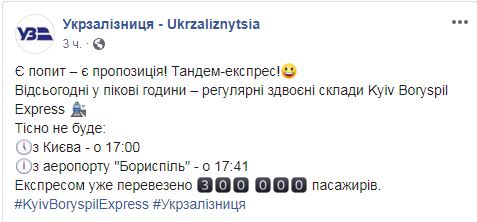 "С сегодняшнего дня в пиковые часы будут курсировать регулярные сдвоенные составы Kyiv Boryspil Express. Из Киева экспресс отправляется в 17:00, а из аэропорта Борисполь - в 17:41", - говорится в сообщении.