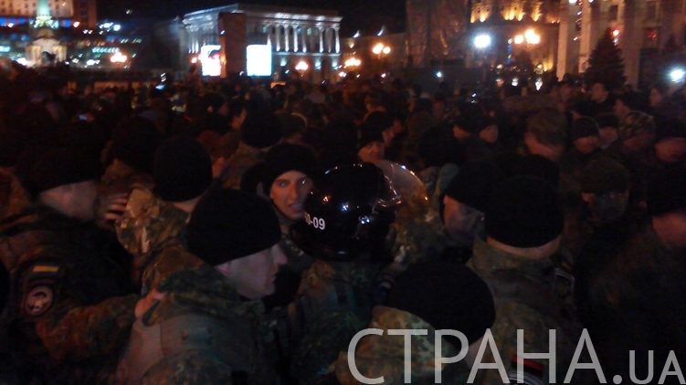 Активисты выдвинулись со стороны отеля "Козацький" (в нем праворадикальные организаторы протестов уже разместили свой "революционный штаб") в сторону Майдана. В руках они несли большие заостренные колья, чтобы установить палатки на Майдане. Но силовики стали в ряд, перекрыв им проход. Протестующие же, некоторые из которых были в балаклавах, пытались прорваться.