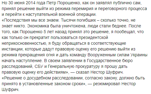 Речь идет о решении Петра Порошенко от 30 июня 2014 года выйти из режима перемирия, переговорного процесса и перейти к наступательной военной операции в Донбассе. "Пять лет назад по договоренности с Турчиновым мы вместе с Виктором Медведчуком были задействованы в организации переговорного процесса по урегулированию конфликта в Донбассе. По состоянию на 30 июня погибших было, по разным данным, 74-86, неофициально говорили о нескольких сотнях. Доллар был по 12, экономика Донбасса была интегрирована в экономику Украины. 23–27 июня состоялись две встречи контактной группы ОБСЕ-Украина-Россия с представителями так называемых ДНР и ЛНР. Украину официально представлял Леонид Кучма, Россию - посол РФ в Украине Михаил Зурабов, в обсуждении принимала представитель ОБСЕ Хайди Тальявини. Те базовые договоренности, которых удалось достигнуть, могли бы стать основой для урегулирования конфликта", - написал парламентарий.