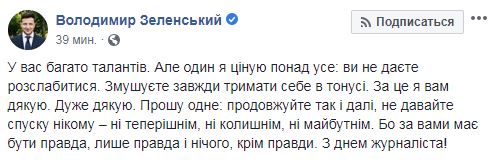 Президент Владимир Зеленский поздравил журналистов с профессиональным праздником и призвал писать исключительно правду. Об этом он написал в Facebook.