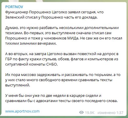 Пресс-секретаря экс-президента Украины Петра Порошенко Святослава Цеголко вызвали на допрос из-за исчезнувших из АП серверов, стульев, обоев и флагов. Об этом сообщил юрист Андрей Портнов.