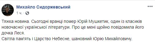 "Сегодня утром умер Юрий Мушкетик, один из классиков современной украинской литературы. Об этом мне только что сообщила его дочь Леся", - написал Сидоржевский.