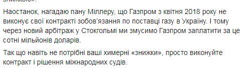 По его словам, "Нафтогаз" сейчас покупает дешевле в Европе, чем Газпром предлагает "со скидкой". "Напоследок, напомню господину Миллеру, что Газпром с апреля 2018 года не выполняет свои контрактные обязательства по поставке газа в Украину. И поэтому через новый арбитраж в Стокгольме мы заставим Газпром заплатить за это сотни миллионов долларов", - подытожил Витренко.