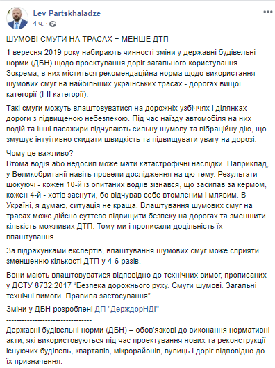 С 1 сентября вступают в силу изменения в государственные строительные нормы по проектированию дорог общего пользования. Осенью может начаться оснащение трасс шумовыми полосами. Об этом на своей страанице в соцсети сообщил заместитель министра регионального развития, строительства и жилищно-коммунального хозяйства Лев Парцхаладзе.