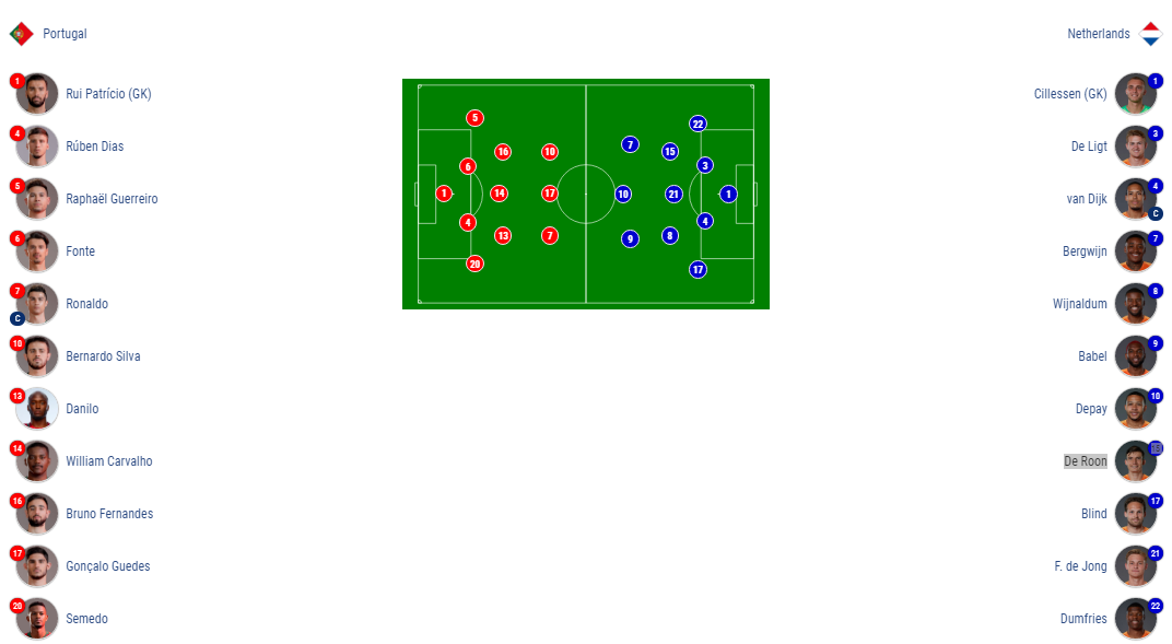 Португалия: Патрисиу - защитники Семеду, Диаш, Фонте, Геррейру - полузащитники Перейра, Карвальо, Б. Фернандеш - нападающие - Б. Силва, Роналду, Гедеш