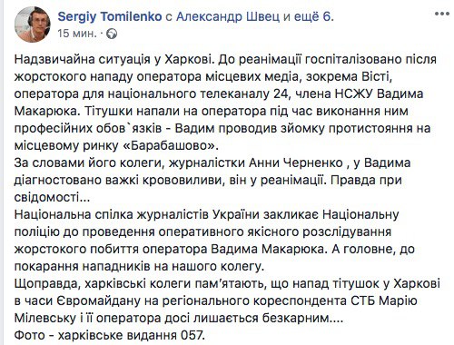 "Национальный союз журналистов Украины призывает Национальную полицию к проведению оперативного качественного расследования жестокого избиения оператора Вадима Макарюка. А главное, к наказанию напавших на нашего коллегу", – отметил Томиленко.