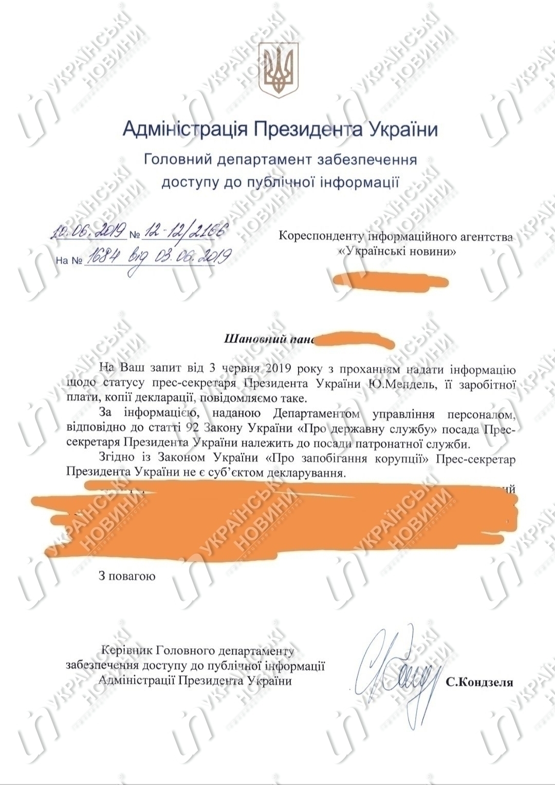 Администрация президента заявила, что пресс-секретарь Владимира Зеленского Юлия Мендель не является субъектом декларирования. Об этом говорится в ответе АП на запрос "Украинских новостей"