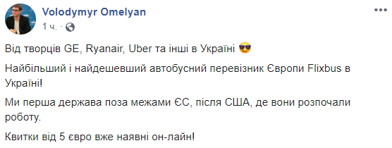 Запуск маршрутов перевозчика прокомментировал у себя в Facebook также министр инфраструктуры, написав, что Украина - первое государство за пределами ЕС, после США, где этот перевозчик начал работу. "От создателей GE, Ryanair, Uber и других в Украине. Крупнейший и самый дешевый автобусный перевозчик Европы Flixbus в Украине! Мы первое государство за пределами ЕС, после США, где они начали работу. Билеты от 5 евро уже имеющиеся он-лайн!" - написал министр.