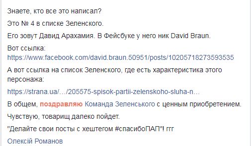 Украинский волонтер Давид Арахамия, который под №4 идет в партийном списке "Слуги народа" сразу после второго тура выборов предложил всем желающим поддержать экс-президента Петра Порошенко "за всю его работу" и поучаствовать во флешмобе с хештегом #спасибоПАП. Об этом Арахамия писал в Facebook. Но сейчас, учитывая его позиции в списке Зеленского, в соцсетях над ним просто смеются.