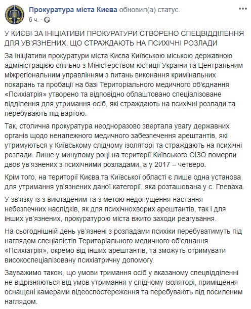Отмечается, что прокуратуры столицы неоднократно обращала внимание госорганов на ненадлежащее медицинское обеспечение заключенных, которые содержатся в Киевском следственном изоляторе и страдают психическими расстройствами. Только в прошлом году на территории Киевского СИЗО умерли двое заключенных с психическими расстройствами, а в 2017 - четверо.